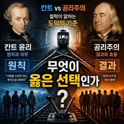 반대편에는 공리주의(Utilitarianism)가 있습니다. 공리주의란 행위의 옳고 그름을 그 결과가 만들어내는 행복의 총량으로 판단하는 윤리 이론으로, 제러미 벤담과 존 스튜어트 밀이 체계화했습니다. "최대 다수의 최대 행복"이 핵심 공식입니다. 1명이 희생되어 5명이 살아남는다면, 공리주의는 그 선택을 도덕적으로 옳다고 판단합니다.