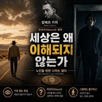 영화를 보고 나서 자연스럽게 알베르 카뮈의 철학이 떠올랐습니다. 카뮈가 말한 부조리(Absurd)란 인간이 의미를 찾으려는 욕망과, 그 의미를 끝내 내어주지 않는 세계 사이의 충돌을 뜻합니다. 여기서 부조리란 단순히 '이상하다'는 의미가 아니라, 존재론적(Ontological) 긴장 상태를 가리키는 철학 용어입니다. 존재론적이란 인간이 세상에 존재하는 방식 자체에 관한 질문과 관련된다는 뜻입니다.